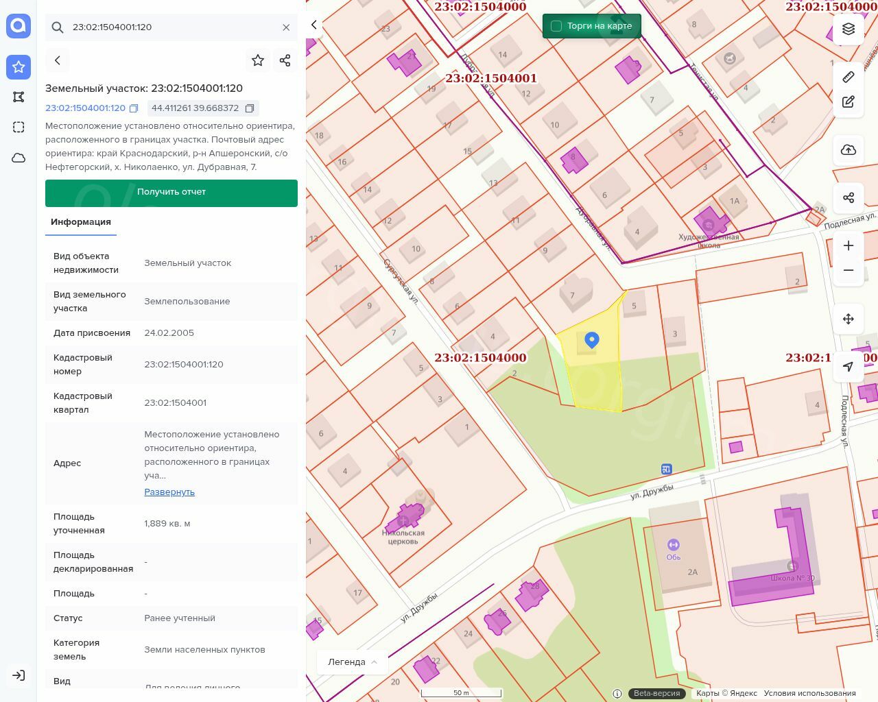 Земельный участок, площадью 1889 +/- 30 кв. м, с кадастровым номером: 23:02:1504001:120 Адрес: почтовый адрес ориентира: край Краснодарский, р-н Апшеронский, с/о Нефтегорский, х. Николаенко, ул. Дубравная, 7;