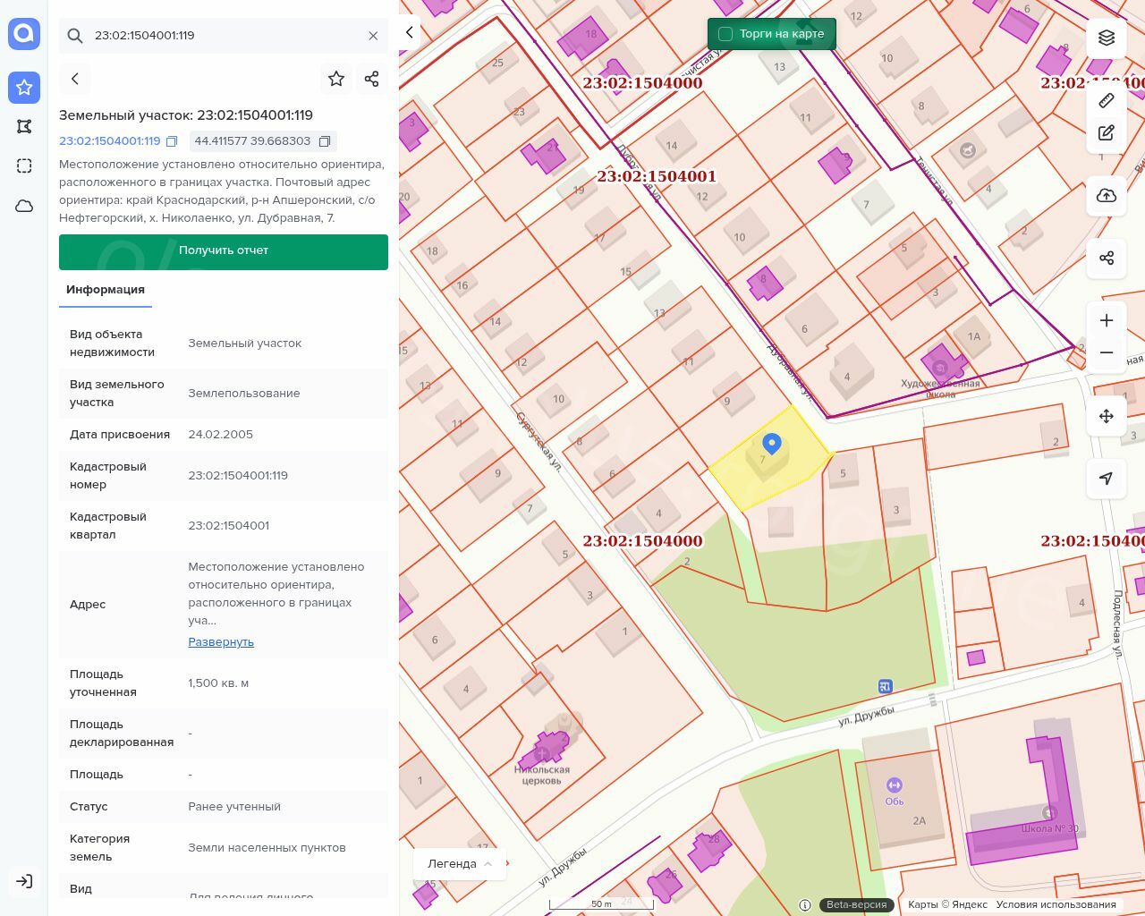 Земельный участок, площадью 1500 +/- 27 кв. м, с кадастровым номером: 23:02:1504001:119 Адрес: почтовый адрес ориентира: край Краснодарский, р-н Апшеронский, с/о Нефтегорский, х. Николаенко, ул. Дубравная, 7;