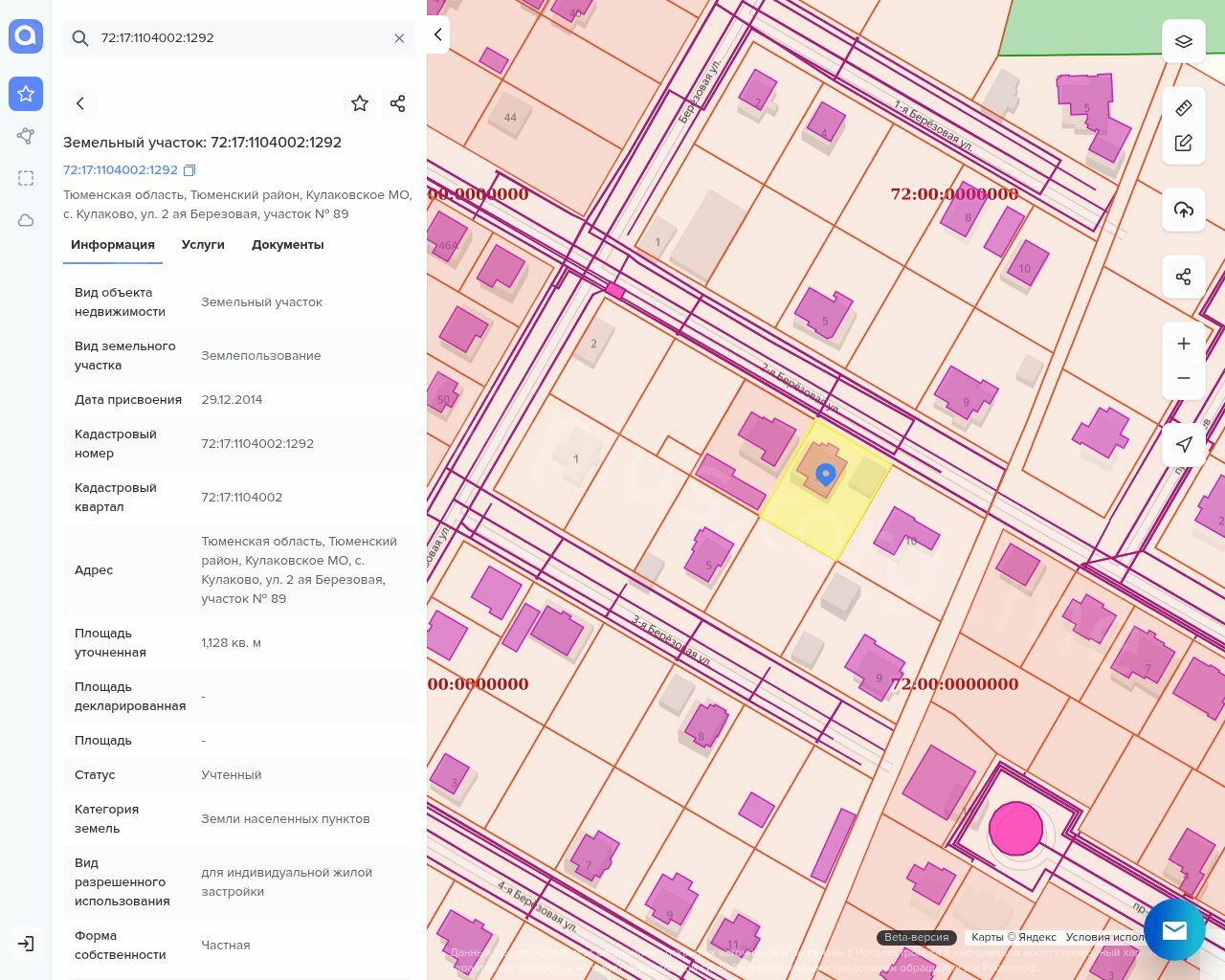 Земельный участок кадастровый номер: 72:17:1104002:1292 Адрес: Тюменская область, Тюменский район, Кулаковское МО, с. Кулаково, ул. 2 ая Березовая, участок 89