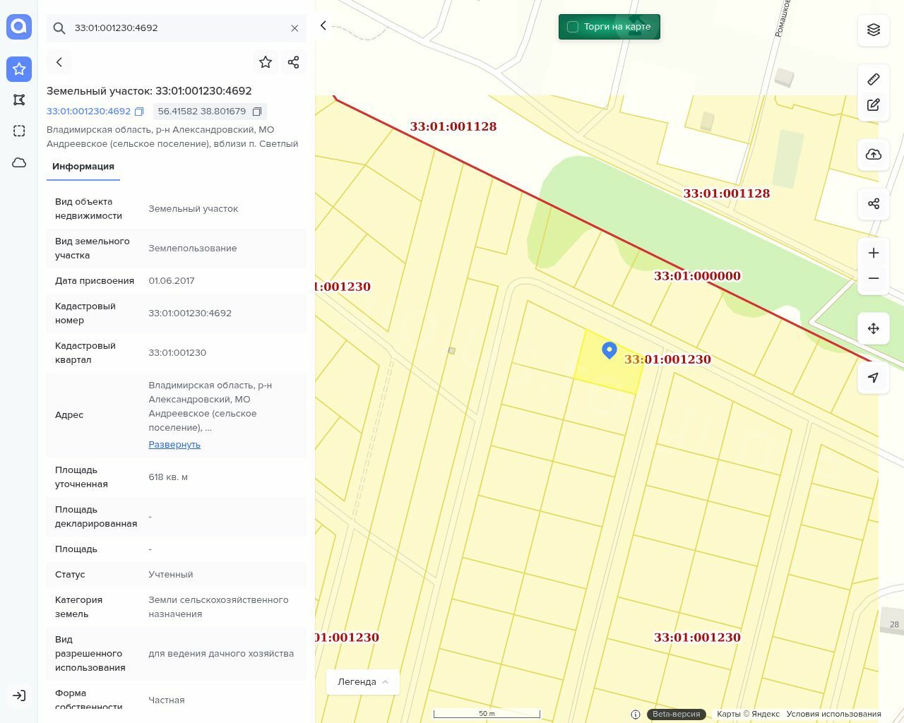 Земельный участок Кадастровый номер: 33:01:001230:4692 Общая площадь, м2: 618, Уточненная площадь, погрешность 17.0 Вид права: Собственность