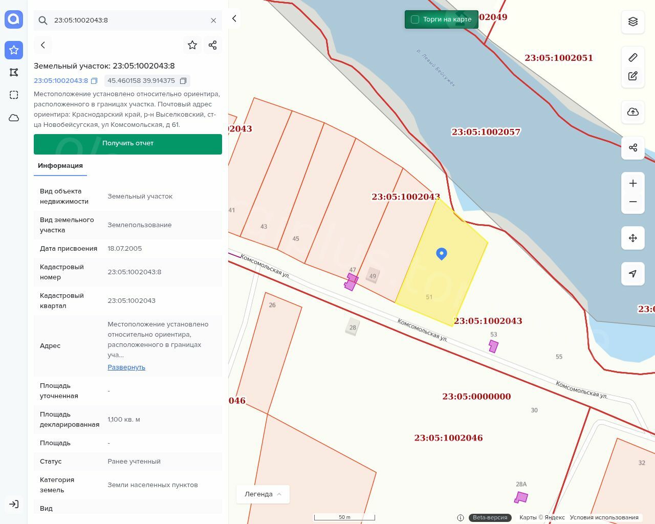 Лот №2 Земельный участок, площадь 1100 кв.м., кадастровый (условный) номер: 23:05:1002043:8. В связи со вступлением в силу изменений в ст. 26 Федерального закона от 13.07.2015 N 218-ФЗ (ред. от 27.02.2025) "О государственной регистрации недвижимости" на основании Федерального закона от 26.12.2024 № 487-ФЗ «О внесении изменений в отдельные законодательные акты Российской Федерации», с 01.03.2025 государственная регистрация земельных участков без определения границ не возможна. В соответствии с условиями настоящих торгов покупатель после заключения договора до его регистрации проводит межевание земельного участка. Расходы по проведение кадастровых работ по определению границ земельного участка (межеванию) возлагаются на покупателя Имущества
