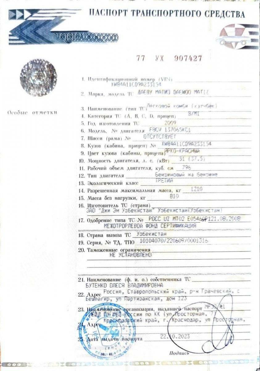 Легковой автомобиль, марка, модель: Daewoo Matiz, год изготовления: 2009 г.в., цвет: ярко-красный, VIN: XWB4A11CD9A233154, ПТС: 77 УХ 907427, модель двигателя: F8CV 137065KC1, тип двигателя: бензиновый, рабочий объем двигателя, куб. см: 196, шасси (рама) № отсутствует, кузов №: XWB4A11CD9A233154, экологический класс: третий, разрешенная максимальная масса: 1210 кг, масса без нагрузки: 810 кг.